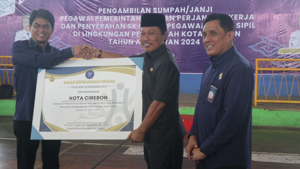 Dalam kesempatan tersebut, Badan Kepegawaian Negara (BKN) juga memberikan penghargaan kepada Pemerintah Kota Cirebon sebagai instansi di wilayah kerja Kantor Regional III BKN yang telah melakukan percepatan pengangkatan Calon Aparatur Sipil Negara (CASN) formasi Tahun 2024. Penghargaan ini menjadi bukti komitmen Pemerintah Kota Cirebon dalam mewujudkan pelayanan kepegawaian yang profesional dan responsif.