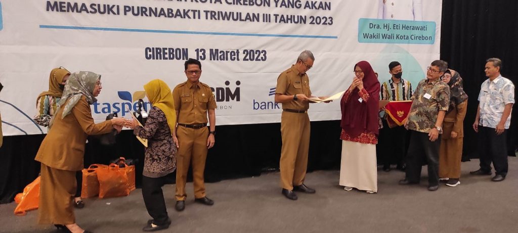 Dalam rangka memberikan penghargaan kepada Pegawai Negeri Sipil yang akan memasuki masa purna bhakti di Lingkungan Pemerintah Daerah Kota Cirebon tepat waktu dan tepat orang, Badan Kepegawaian dan Pengembangan Sumber Daya Manusia (BKPSDM) Kota Cirebon melaksanakan Penyerahan Sk Pensiun Dan Tanda Penghargaan Kepada Pegawai Negeri Sipil Di Lingkungan Pemerintah Daerah Kota Cirebon Yang Akan Memasuki Masa Purnabhakti periode Juli sd September 2023, Senin 13 Maret 2022 bertempat di Hotel Prima Kota Cirebon.