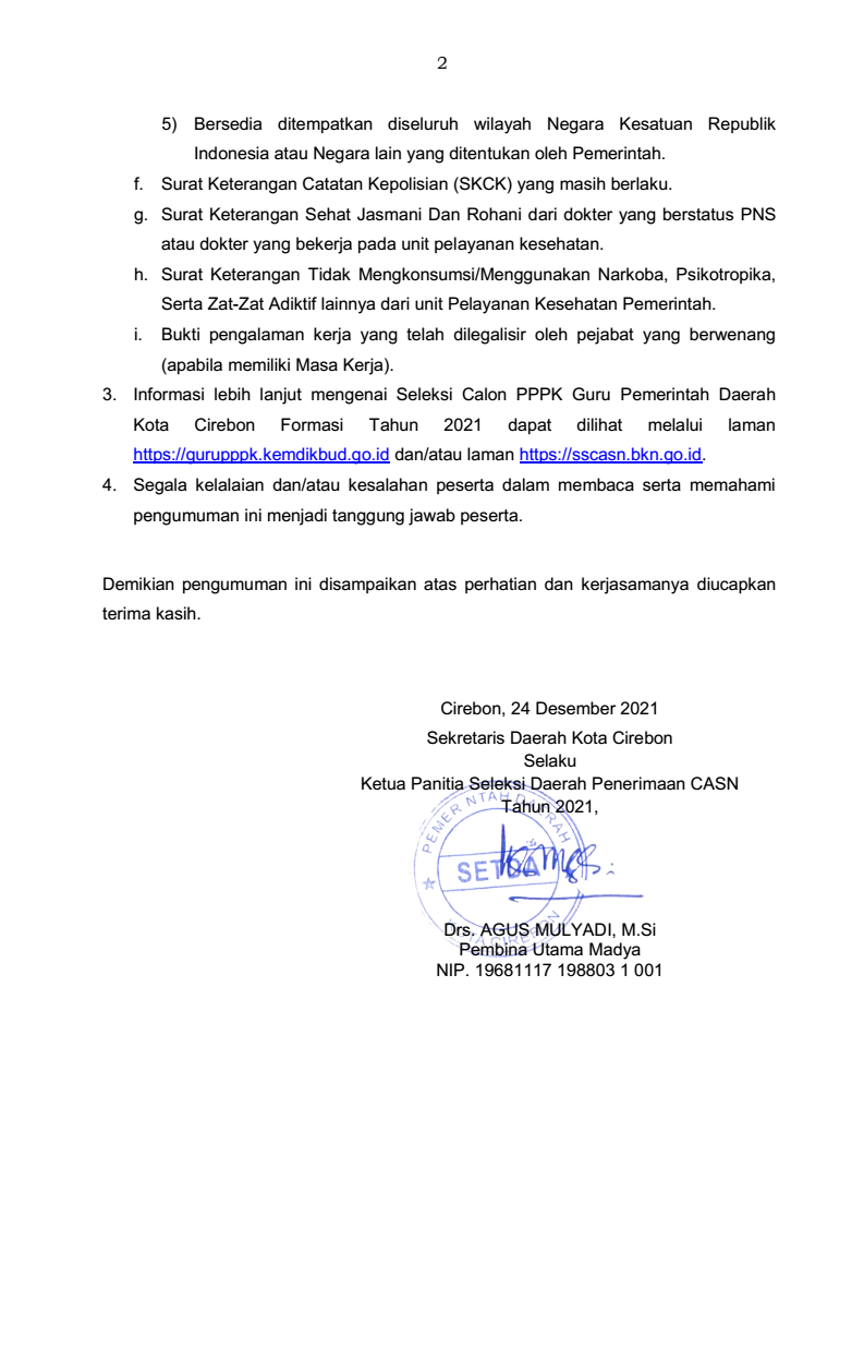Pemberkasan Penetapan Nomor Induk PPPK Guru Pemerintah Daerah Kota Cirebon Formasi Tahun 2021