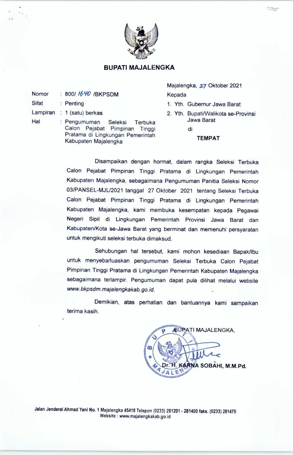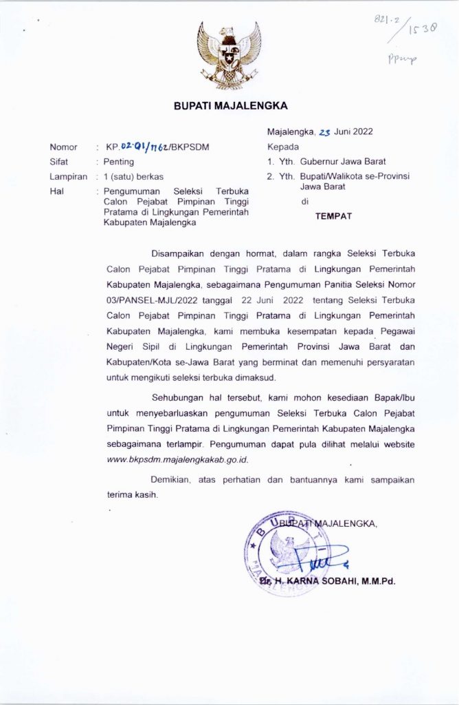 Pemerintah Kabupaten Majalengka membuka kesempatan kepada Bapak/Ibu yang memenuhi syarat untuk mengikuti seleksi terbuka Calon Pimpinan Tinggi Pratama di Lingkungan Pemerintah Kabupaten Majalengka. Informasi lengkap dapat mengunjungi www.bkpsdm.majalengkakab.go.id