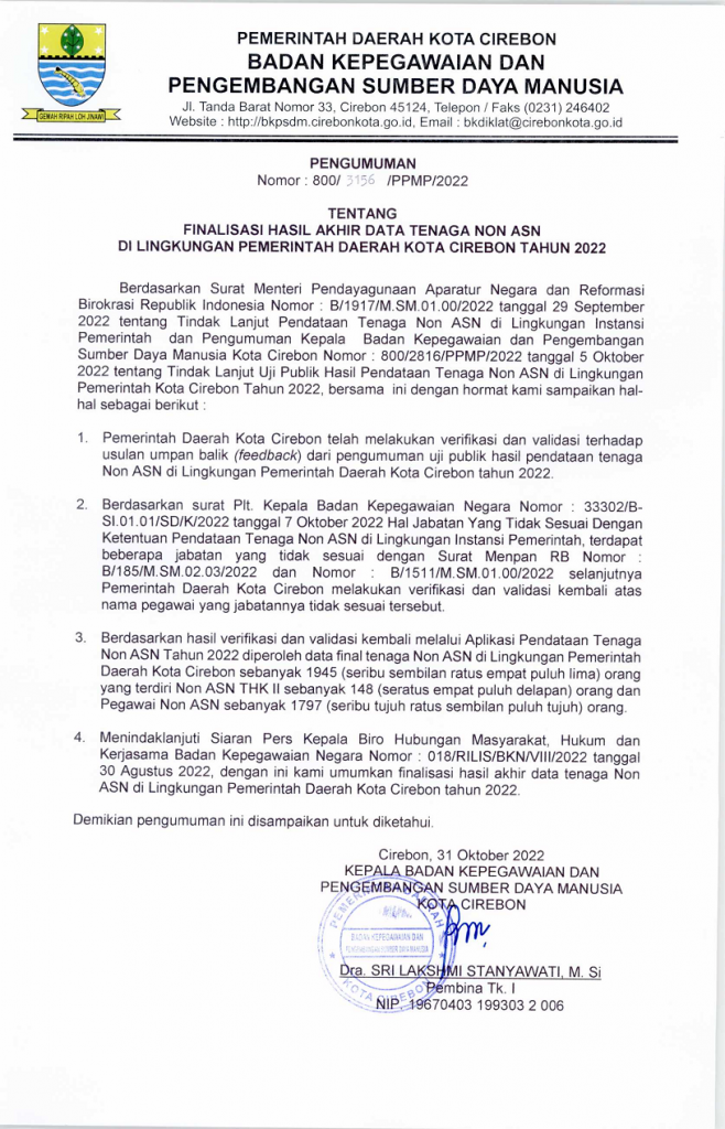 Pengumuman Finalisasi Hasil Akhir Tenaga Non Asn di Lingkungan Pemerintah Daerah Kota Cirebon Tahun 2022
