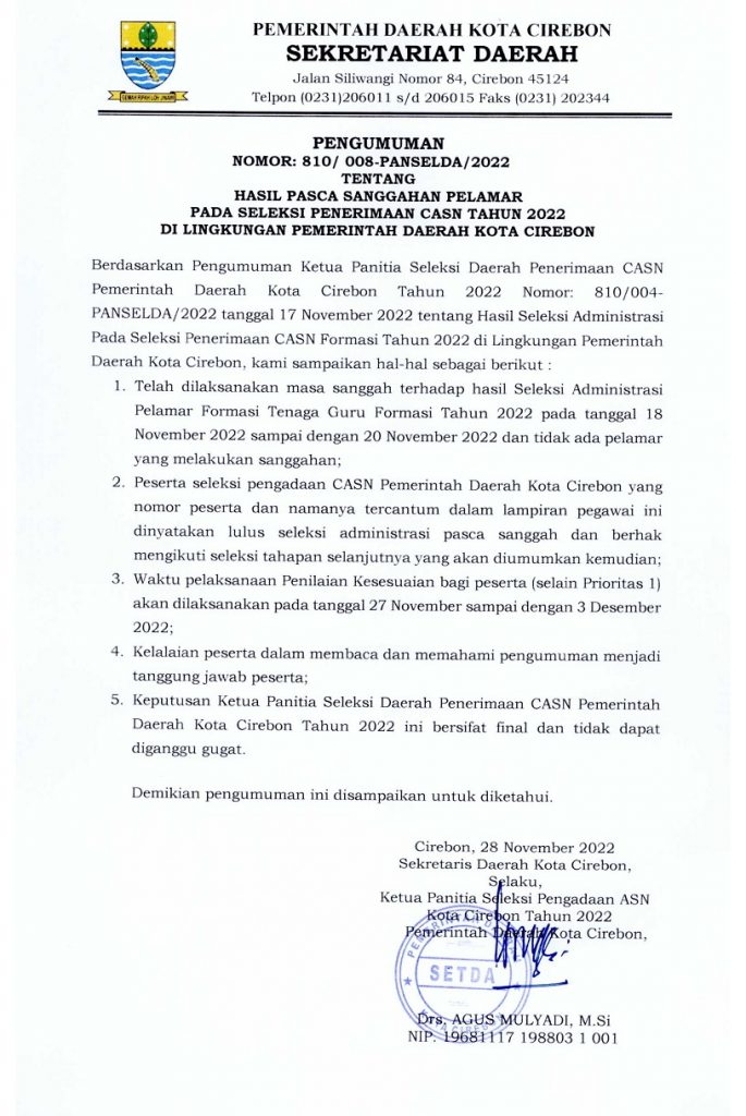 Hasil Pasca Sanggah Pengadaan Calon Pegawai Negeri Sipil di Lingkungan Pemerintah Kota Cirebon Tahun Anggaran 2024