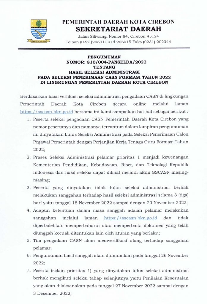 Hasil Pasca Sanggah Pengadaan Calon Pegawai Negeri Sipil di Lingkungan Pemerintah Kota Cirebon Tahun Anggaran 2024