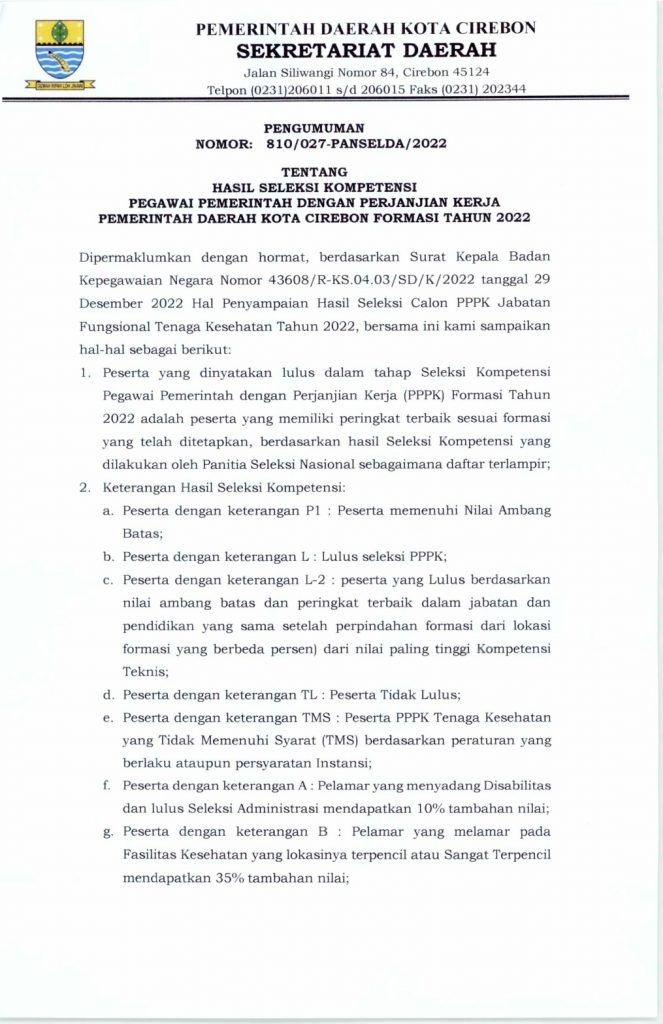 <strong>PENGUMUMAN HASIL SELEKSI KOMPETENSI PEGAWAI PEMERINTAH DENGAN PERJANJIAN KERJA PEMERINTAH DAERAH KOTA CIREBON FORMASI TAHUN 2022</strong>