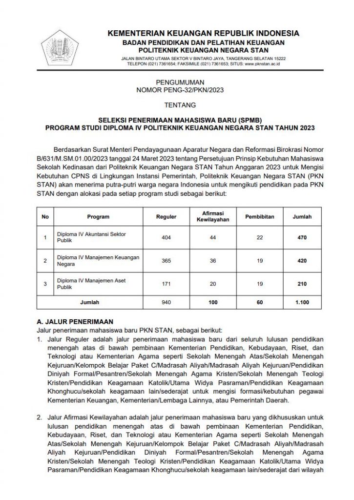 SELEKSI PENERIMAAN MAHASISWA BARU (SPMB) PROGRAM STUDI DIPLOMA IV POLITEKNIK KEUANGAN NEGARA STAN TAHUN 2023